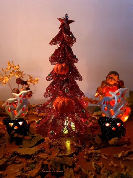 Mi riferisco all'albero della Vigilia di Ognissanti/Halloween, decorato con le zucche, icone per eccellenza della festa che incise raffigurano il volto di un morto e contrassegnano le anime del purgatorio - le Jack O' Lantern sospese tra inferno e paradiso che vagano alla ricerca della redenzione (vedi Halloween); aggiungo qualche angioletto che ricordi loro e i santi, fantasmini vari a rappresentare chi torna dall'aldilà, frutta e dolci autunnali per il banchetto e soprattutto le foto dei miei cari defunti, il puntale è un pentagramma* con sopra una croce a rappresentare le cinque piaghe di Cristo e la sua morte; l'otto dicembre sostituisco quest'albero con quello natalizio seguendo un cammino simbolico che dalla morte porta alla vita.